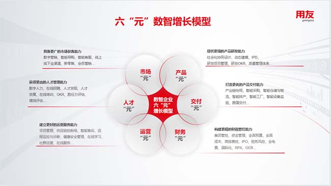基于對(duì)典型客戶的分析,結(jié)合知名管理理論和過往實(shí)踐,用友將成長(zhǎng)型企業(yè)經(jīng)營(yíng)管理的基本要素進(jìn)一步抽象,以“元”為初始,重磅推出了全新的企業(yè)價(jià)值模型,即六“元”數(shù)智增長(zhǎng)模型。