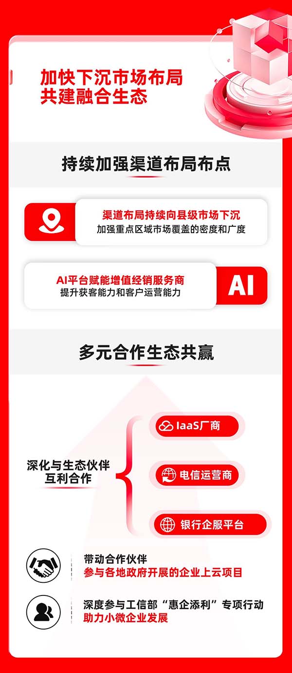 與此同時(shí),暢捷通深化與電信運(yùn)營(yíng)商、華為云等IaaS廠(chǎng)商、銀行企服平臺(tái)的互利合作,形成資源互補(bǔ)、場(chǎng)景互通的生態(tài)合作網(wǎng)絡(luò)。