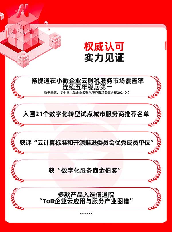 根據(jù)易觀發(fā)布的《中國(guó)小微企業(yè)云財(cái)稅服務(wù)市場(chǎng)專(zhuān)題分析2024》,暢捷通在小微企業(yè)云財(cái)稅服務(wù)市場(chǎng)覆蓋率連續(xù)五年穩(wěn)居第一,在用戶(hù)滿(mǎn)意度、產(chǎn)品性能及廠(chǎng)商綜合實(shí)力等核心維度的調(diào)研評(píng)測(cè)中均名列第一。公司還榮獲“云計(jì)算標(biāo)準(zhǔn)和開(kāi)源推進(jìn)委員會(huì)優(yōu)秀成員單位”稱(chēng)號(hào)。此外,暢捷通入選了多項(xiàng)企業(yè)財(cái)稅服務(wù)創(chuàng)新排行榜,多款產(chǎn)品入選中國(guó)信通院“ToB企業(yè)云應(yīng)用與服務(wù)產(chǎn)業(yè)圖譜”。