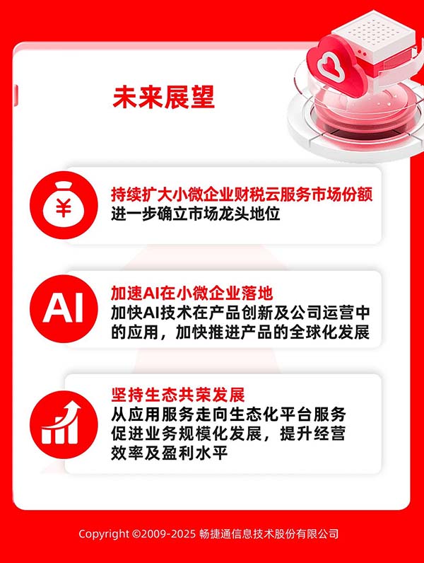 未來(lái),暢捷通將持續(xù)擴(kuò)大小微企業(yè)財(cái)稅云服務(wù)市場(chǎng)份額,進(jìn)一步鞏固小微企業(yè)財(cái)稅云服務(wù)市場(chǎng)龍頭地位,搶占小微企業(yè)云服務(wù)市場(chǎng)龍頭地位,堅(jiān)定秉持客戶(hù)成功原則,持續(xù)提升產(chǎn)品競(jìng)爭(zhēng)力,加快推進(jìn)產(chǎn)品的全球化發(fā)展。與此同時(shí),暢捷通將加速AI在小微企業(yè)落地,加快AI技術(shù)在產(chǎn)品創(chuàng)新及公司運(yùn)營(yíng)中的應(yīng)用,堅(jiān)持生態(tài)共榮發(fā)展,從應(yīng)用服務(wù)走向生態(tài)化平臺(tái)服務(wù),促進(jìn)業(yè)務(wù)規(guī)?;l(fā)展,提升經(jīng)營(yíng)效率及盈利水平。