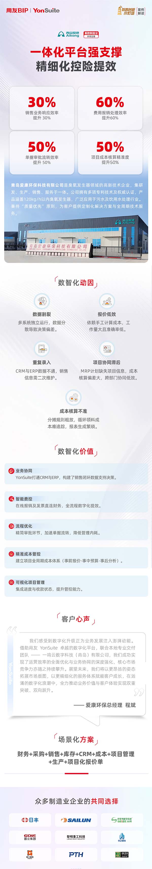 “臭氧發(fā)生器的核心是‘精準’—— 精準的臭氧濃度、精準的反應時間,才能保證水質安全。企業(yè)管理也是如此,只有精準的成本管控、高效的協(xié)同效率,才能支撐企業(yè)持續(xù)發(fā)展。” 愛康環(huán)??偨浝沓瘫笤谡劶稗D型時感慨道,“YonSuite 為我們注入了‘精準基因’,讓成本可量化、流程可追蹤、決策有依據。未來,我們將以更精細化的管理和更可靠的產品,讓每一臺臭氧發(fā)生器都成為客戶信賴的‘水質衛(wèi)士’。”