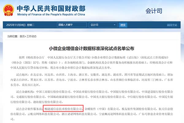 暢捷通入選財(cái)政部小微企業(yè)增信會(huì)計(jì)數(shù)據(jù)標(biāo)準(zhǔn)深化試點(diǎn)服務(wù)商
