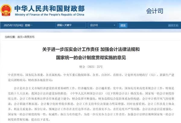 近日,財(cái)政部《關(guān)于進(jìn)一步壓實(shí)會計(jì)工作責(zé)任 加強(qiáng)會計(jì)法律法規(guī)和國家統(tǒng)一的會計(jì)制度貫徹實(shí)施的意見》(財(cái)會〔2025〕25號)正式落地。新規(guī)進(jìn)一步明確會計(jì)責(zé)任主體、強(qiáng)化數(shù)據(jù)合規(guī)要求,推動企業(yè)從“被動合規(guī)”向“主動提效”轉(zhuǎn)變。