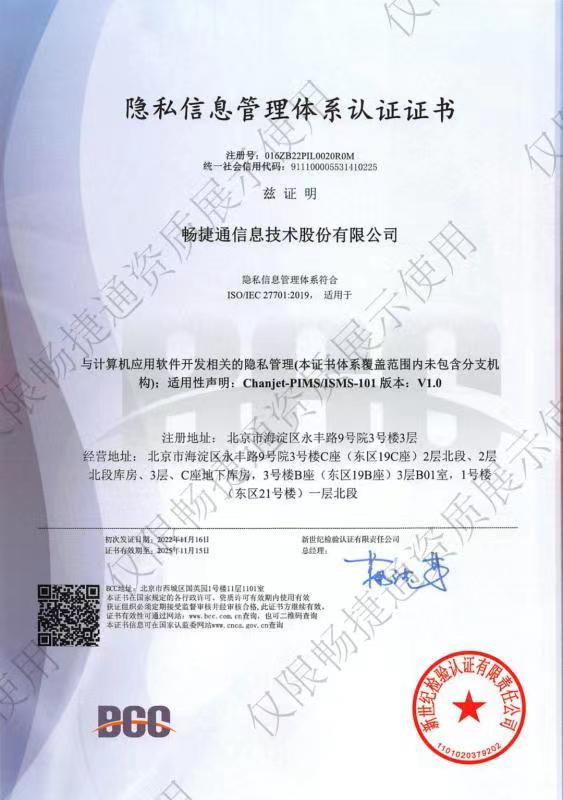 ISO27701是國(guó)際標(biāo)準(zhǔn)化組織(ISO)和國(guó)際電?工委員會(huì)(IEC)聯(lián)合發(fā)布的隱私信息管理體系國(guó)際標(biāo)準(zhǔn),它是對(duì)ISO27001信息安全管理體系的擴(kuò)展。ISO27701不僅是一個(gè)管理體系,還是一個(gè)通用的信息安全控制措施集合,在14個(gè)控制域里提出了35個(gè)安全控制目標(biāo)和114個(gè)控制措施,全面保障公司的信息安全。用友暢捷通已于2021年就通過了ISO27001資質(zhì)認(rèn)證。