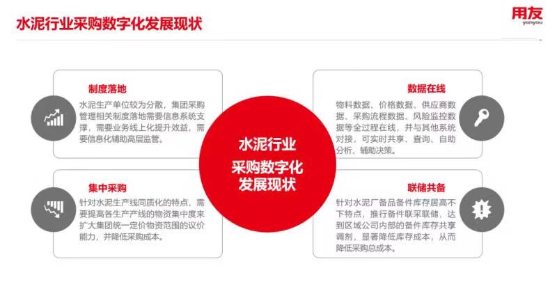 用友以企業(yè)采購(gòu)數(shù)智化變革研究為基礎(chǔ),針對(duì)水泥行業(yè)進(jìn)行專項(xiàng)分析,發(fā)布用友BIP水泥行業(yè)采購(gòu)及供應(yīng)鏈解決方案。