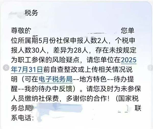 您單位所屬期5月份社保申報(bào)人數(shù)2人,個(gè)稅申報(bào)人數(shù)30人,差異28人,存在未按規(guī)定為職工參保的風(fēng)險(xiǎn)疑點(diǎn),請(qǐng)您單位在2025年7月31日前自查整改或上傳相關(guān)情況說(shuō)明。請(qǐng)您及時(shí)為參保人員繳納社保費(fèi),多謝你的合作!