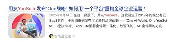 它提出的“雙One”,既是對(duì)未來(lái)的宏大描繪,也是對(duì)自身角色的精準(zhǔn)定位:One AI-World,勾勒AI驅(qū)動(dòng)的新商業(yè)世界;One YonSuite,宣示成為全球成長(zhǎng)型企業(yè)最優(yōu)核心平臺(tái)的決心,也意味著一次 All-in-ONE 的戰(zhàn)略升級(jí)。